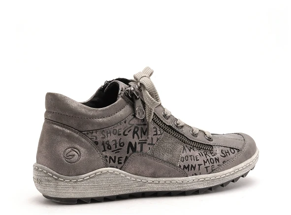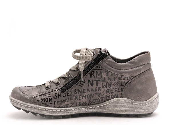 Cette basket en cuir gris avec une impression d’écriture manuscrite est signée Remonte . Elle est extrèmement facile à chausser grâce à son lacet et sa fermeture éclair. Ce modèle montant est munie d’une voûte plantaire pour amortir les chocs et d’une semelle souple et légère, ces boots sont aussi confortables qu’élégantes en toutes circonstances.